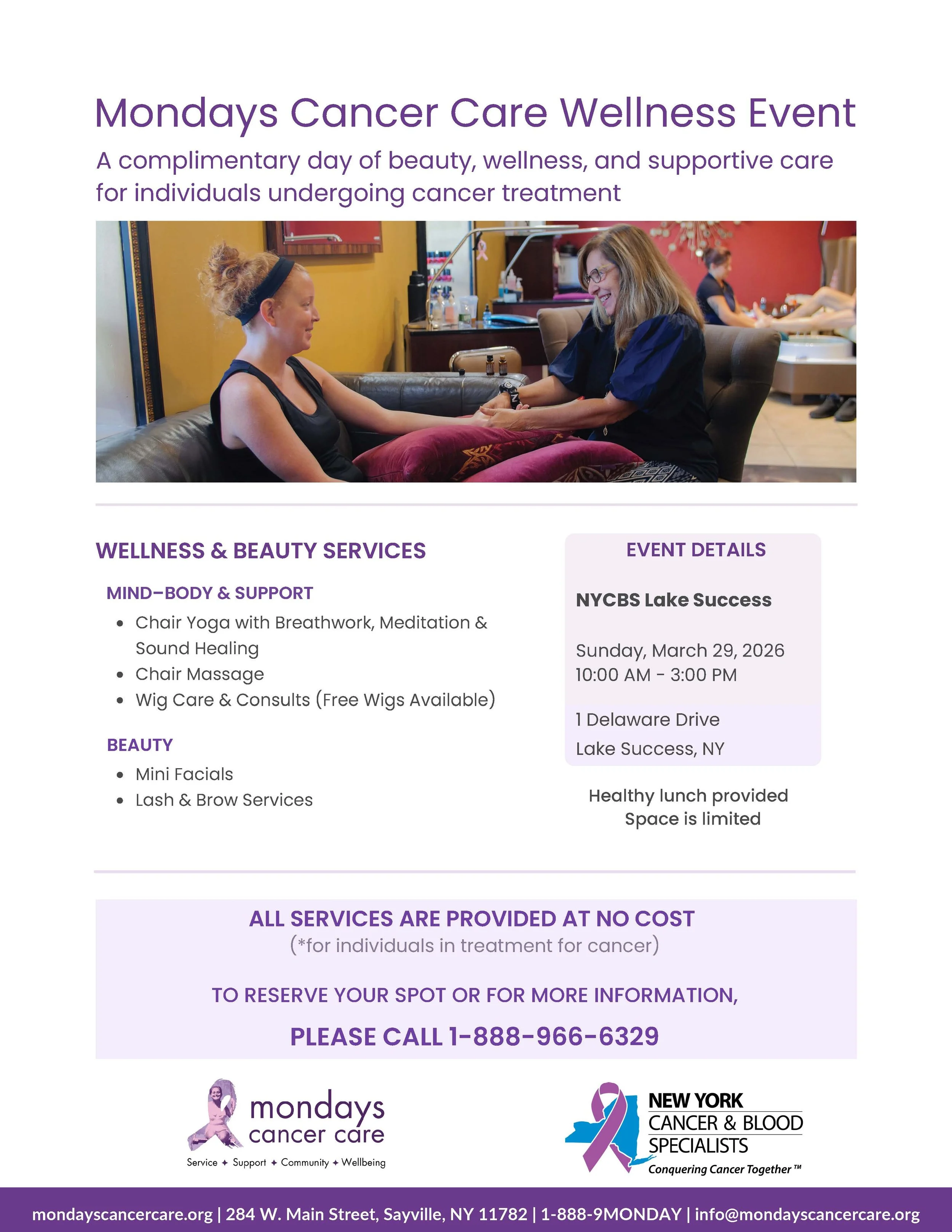 Mondays Cancer Care Wellness Event - NYCBS Lake Success Sunday, March 29, 2026 10:00 AM 3:00 PM NYCBS Lake Success 1 Delaware Drive New Hyde Park, NY, 11042 United States (map) Google Calendar ICS