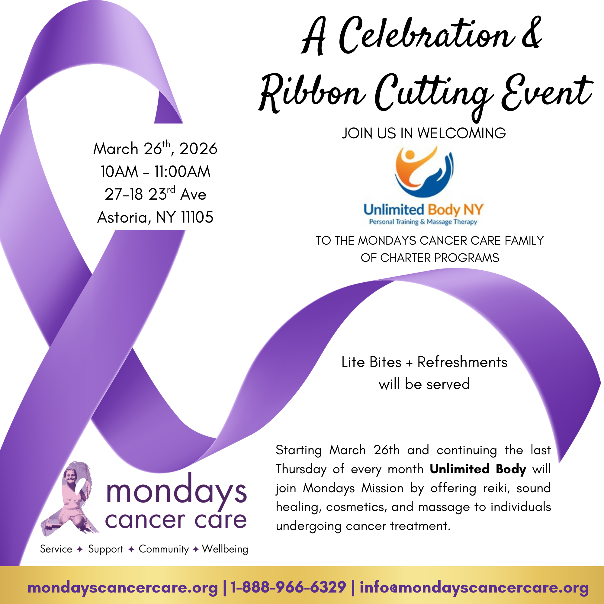 Back to All Events Unlimited Body - Ribbon Cutting! Thursday, March 26, 2026 10:00 AM 11:00 AM Unlimited Body 27-18 23rd Avenue Queens, NY, 11105 United States (map) Google Calendar ICS